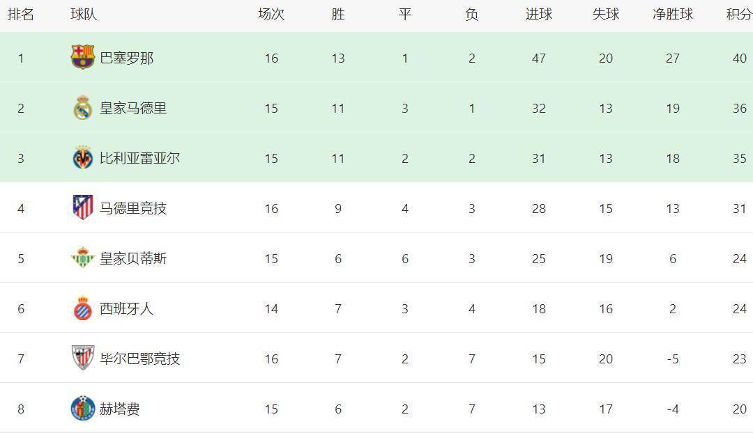 15轮战罢,西甲积分榜的形势变得越来越清晰。巴塞罗那以13胜1平2负积40分的战绩高居榜首,他们强大的攻击火力是领跑的关键,15轮轰入47球的数据冠绝联赛。皇家马德里在少赛一轮的情况下,以11胜3平1负积36分紧随其后。皇马与巴萨的“二人转”似乎仍是主旋律,但比利亚雷亚尔的强势插入,让争冠格局多了一丝不确定性。
