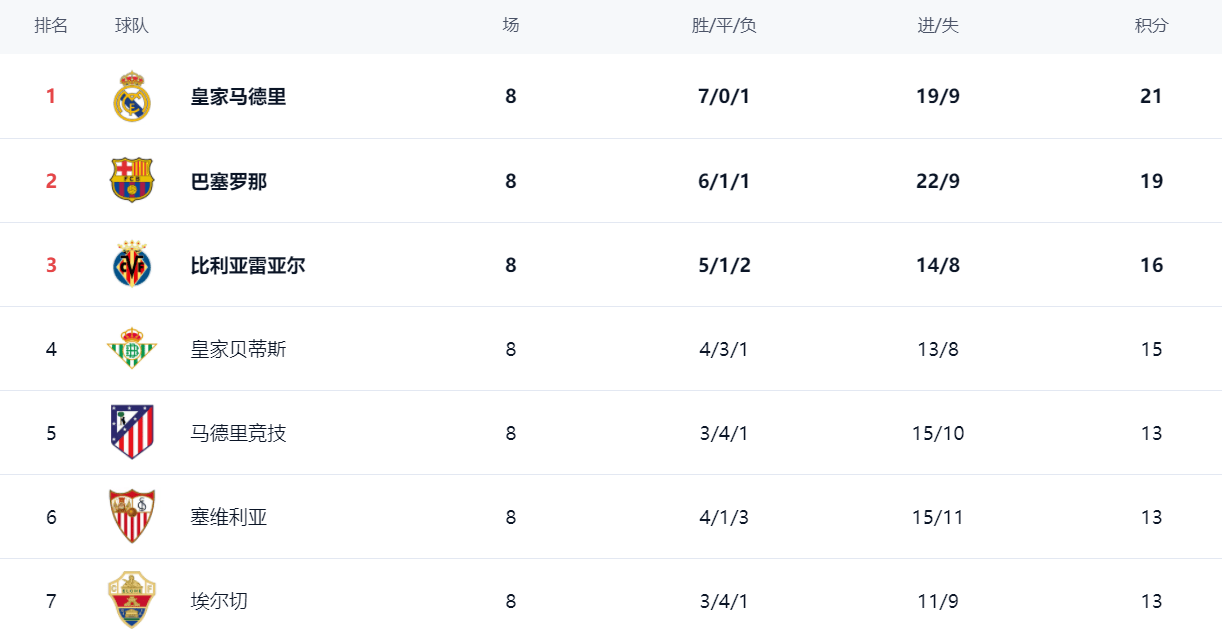 在积分榜上,皇马以21分高居榜首。巴萨输球,依然是19分,只能排名第2。比利亚雷亚尔以16分排名第3。第4的是皇家贝蒂斯,拿到15分。而马竞只拿到13分,排名第5。塞维利亚、埃尔切和毕尔巴鄂竞技也都是13个积分,排名第6到第8。返回搜狐,查看更多
