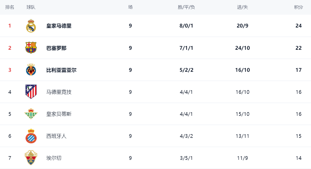 在积分榜上,皇马再次登顶。皇马8胜1负,拿到了24分。巴萨紧随其后,7胜1平1负的战绩,拿到22分。比利亚雷亚尔以17分排名第3。第4的是马竞,4胜4平1负,拿到16分。皇家贝蒂斯也是16分,排名第5。西班牙人以15分排名第6。返回搜狐,查看更多