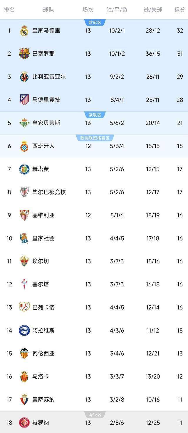 在西甲中游集团,皇家贝蒂斯以20分排名第五,西班牙人18分位列第六,赫塔费和毕尔巴鄂竞技同积17分。 塞维利亚和皇家社会都是16分,皇家社会本轮3-1逆转奥萨苏纳,取得了关键的客场胜利。