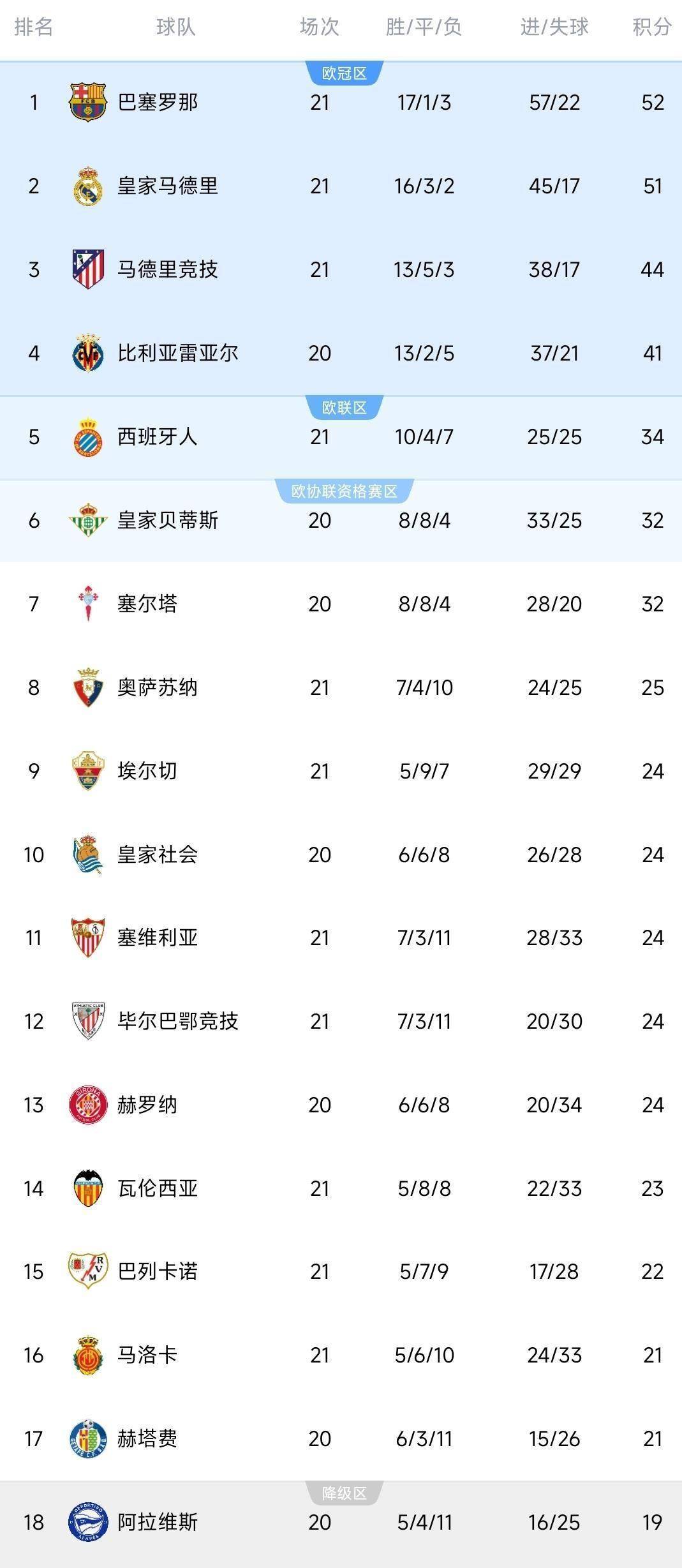 随着这两场比赛结束,西甲联赛第21轮后的积分榜发生了关键变动。 巴塞罗那凭借这场胜利,积分达到52分,成功超越了本轮未赛的皇家马德里,重新登上了联赛榜首的位置。