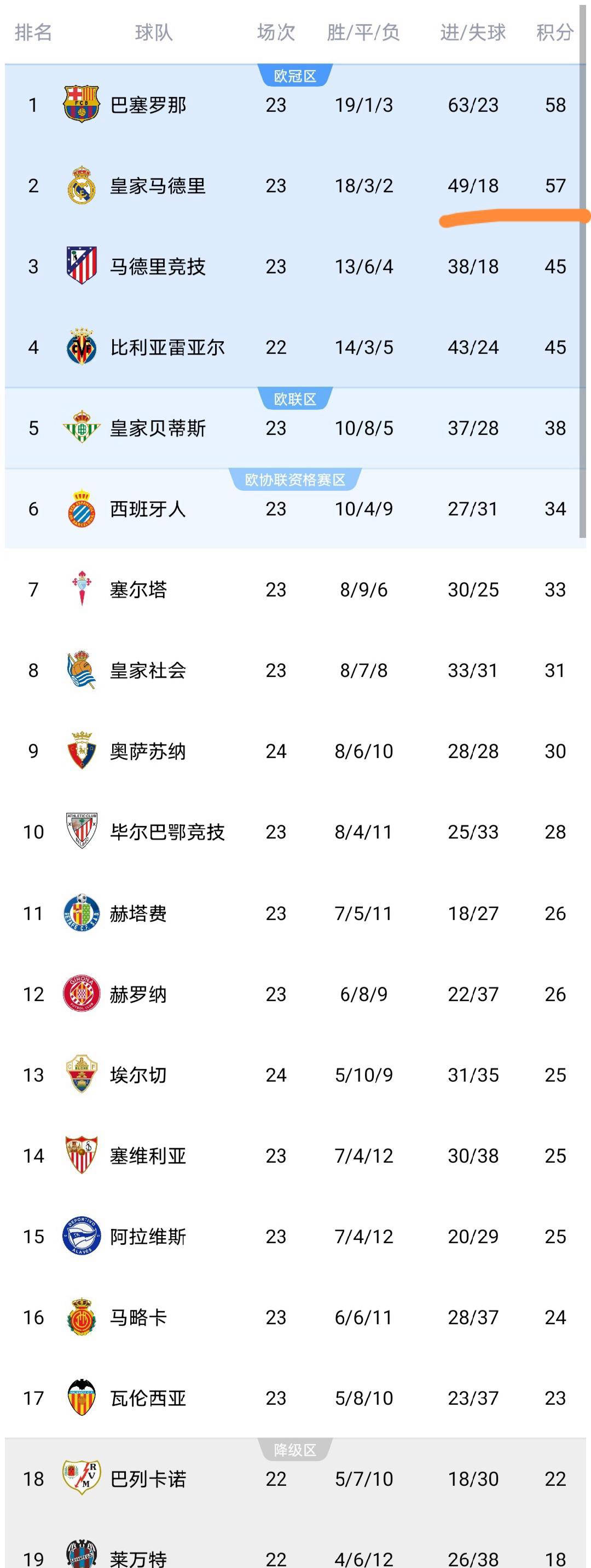 至于积分榜前列,排名依旧稳定,巴塞罗那、皇家马德里、马德里竞技和比利亚雷亚尔稳居前四。巴萨与皇马之间的积分差距仅为1分,冠军争夺进入白热化阶段,接下来的每场比赛都备受关注。
