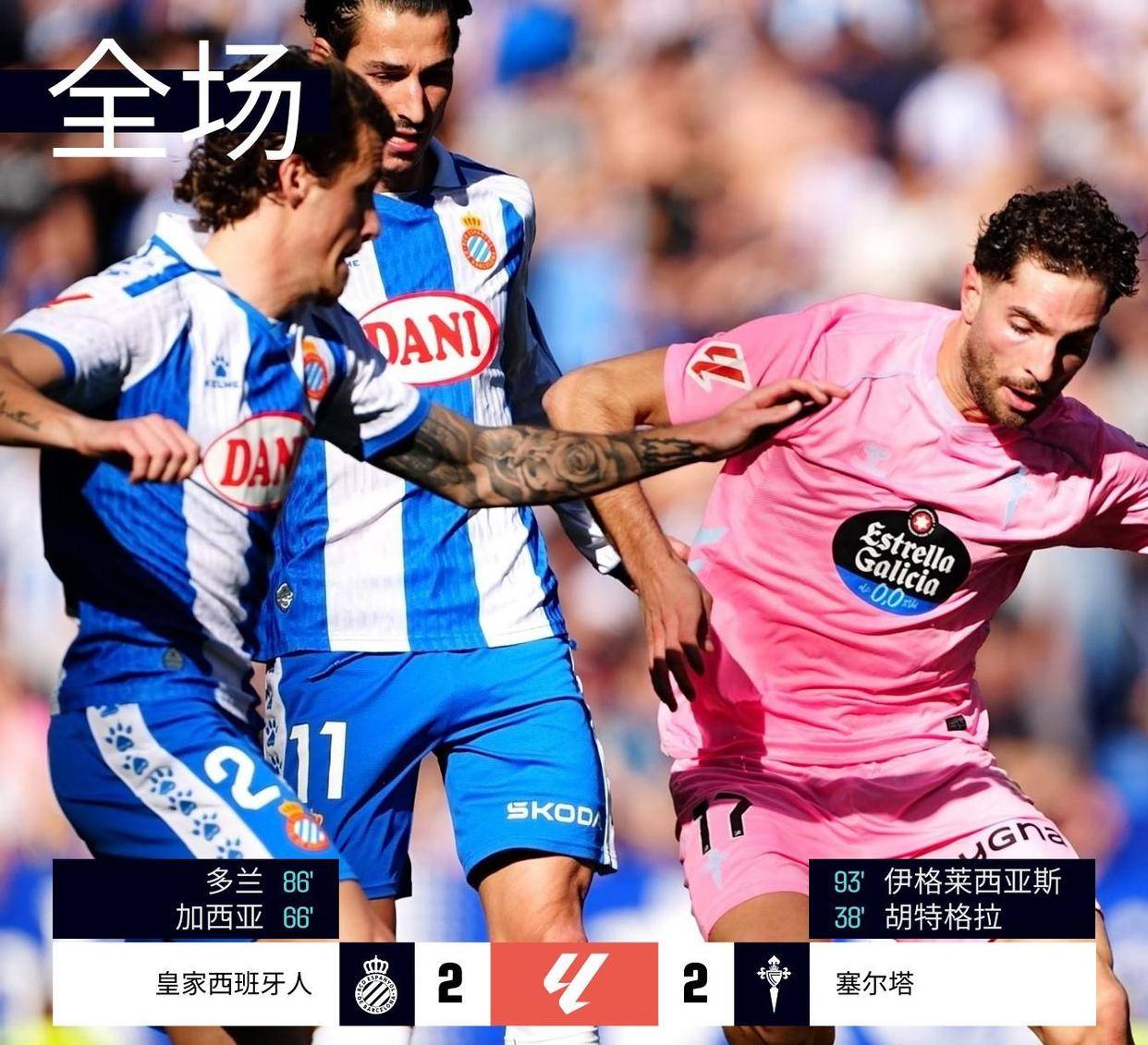 西班牙人2-2塞尔塔: 西班牙人与塞尔塔上演进球大战,最终以2比2的比分握手言和。比赛第38分钟,西班牙人的胡特格拉率先破门,客队塞尔塔取得领先。直到第66分钟,塞尔塔的基克-加西亚才将比分扳平。比赛尾声,第86分钟,西班牙人队的球员多兰打入一球,帮助球队反超比分。在比赛的伤停补时阶段,伊格莱西亚斯在门前抓住机会破门,将比分最终定格在2比2。返回搜狐,查看更多