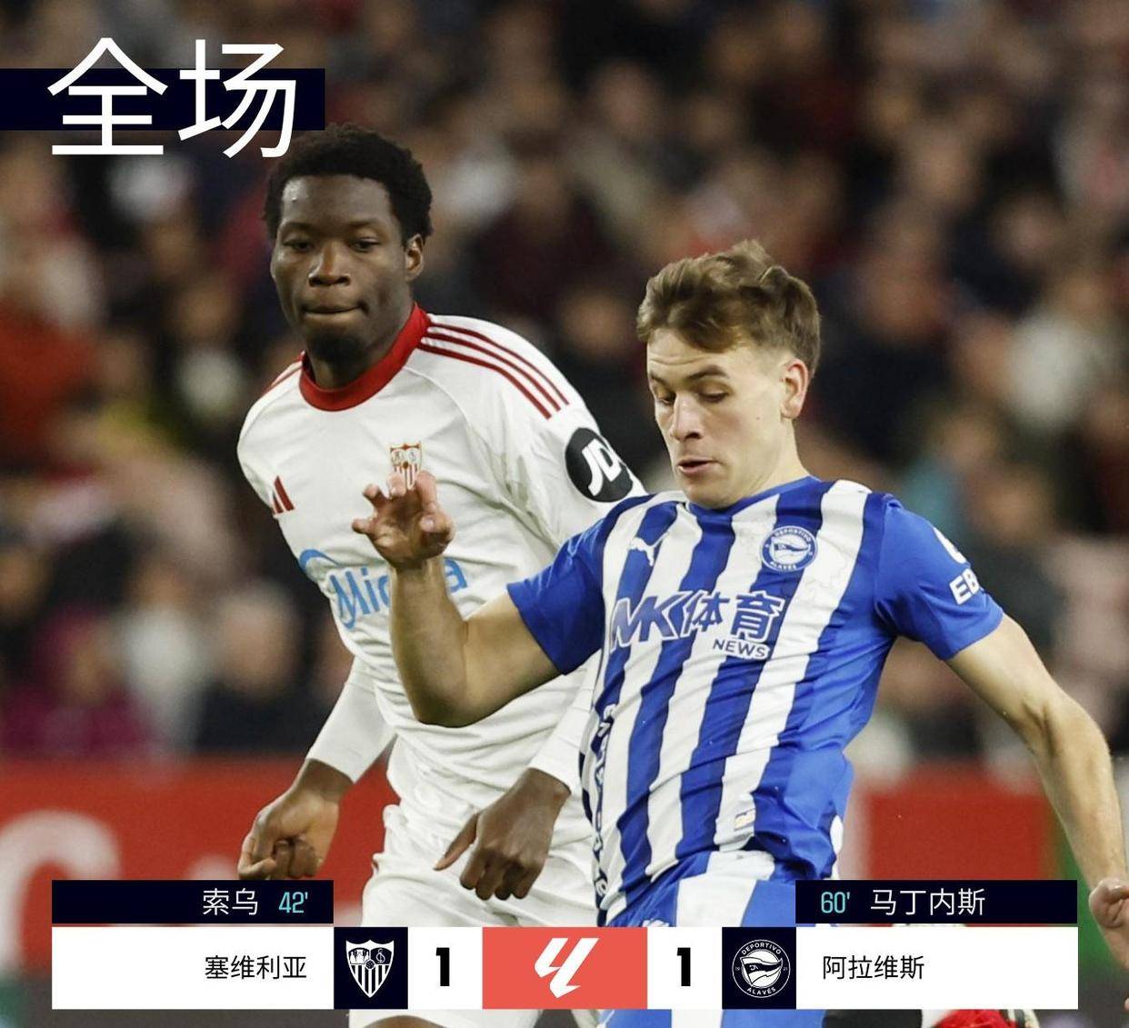 塞维利亚1-1阿拉维斯: 塞维利亚与阿拉维斯握手言和。上半场第42分钟,塞维利亚的索乌凭借一脚精彩的远射,帮助球队以1比0领先结束上半场。下半场第60分钟,阿拉维斯的托尼·马丁内斯头球破门,将比分扳平。最终,双方未能再次改写比分,各取一分。