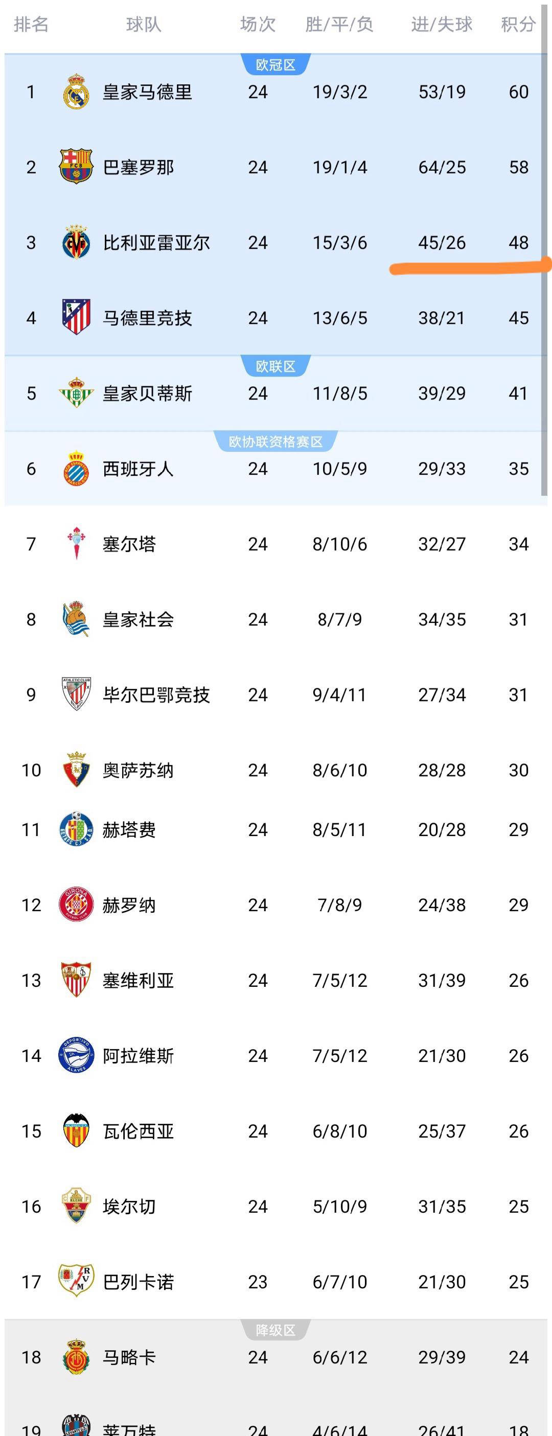 比利亚雷亚尔在这场硬仗中成功斩获三分,目前积48分,稳居积分榜第3位。尽管球队距离第二名巴塞罗那还有10分差距,与领头羊皇家马德里更是相差12分,使得争冠形势较为严峻,但比利亚雷亚尔依旧保持了强劲的竞争态势。他们领先第四名马德里竞技3分,领先第五名皇家贝蒂斯7分,确保了球队在争夺欧冠席位上的有利位置。换言之,虽然冠军可能性不大,但锁定下个赛季欧洲最高水平联赛的资格依然充满希望。