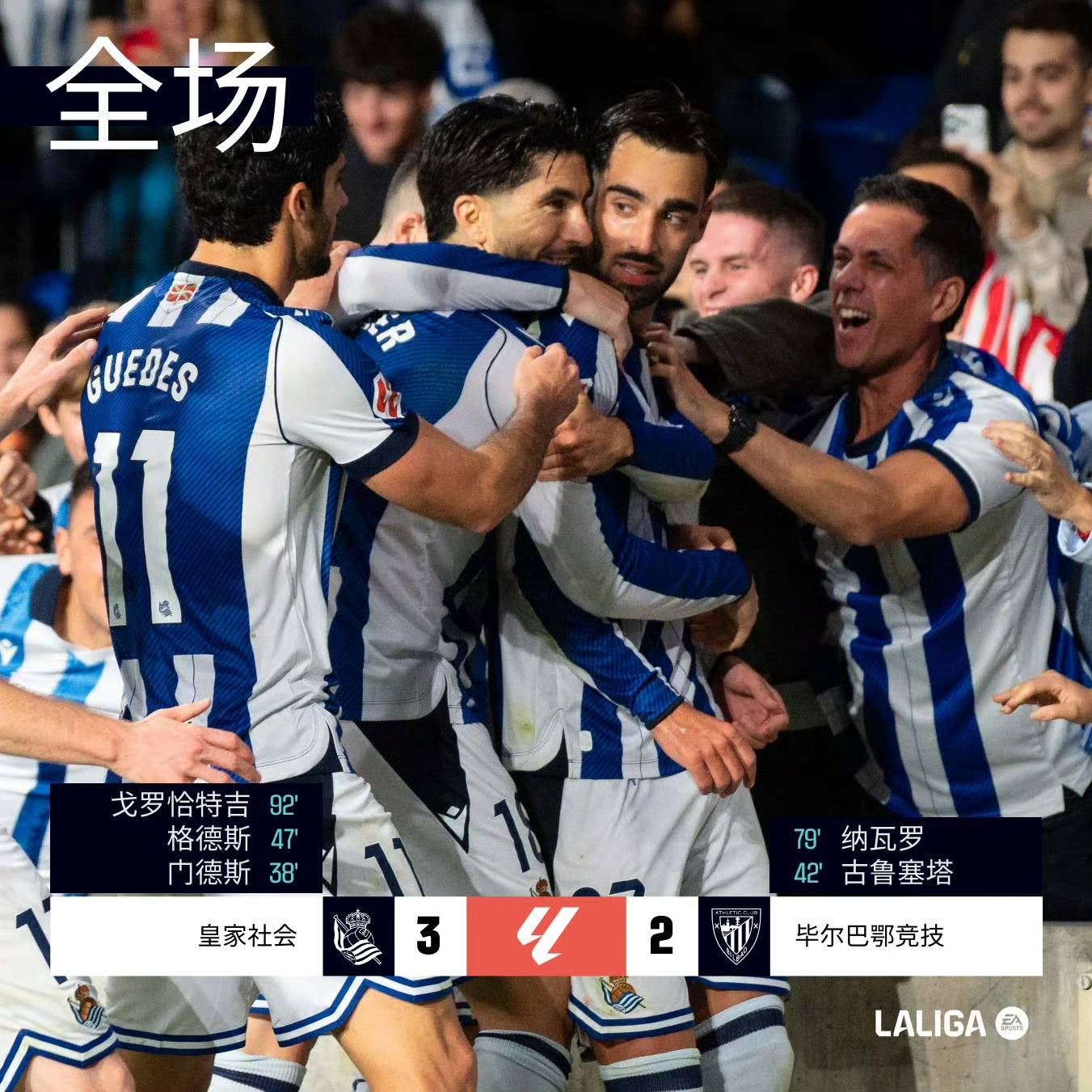 在巴斯克德比中,皇家社会以3-2战胜毕尔巴鄂竞技,布赖斯-门德斯、贡萨洛-格德斯和戈罗恰特吉的进球帮助球队取胜,而毕尔巴鄂的古鲁泽塔和纳瓦罗尽管破门,但未能阻止对方的胜利。皇家社会的攻势十分强劲,展现了强队气质。