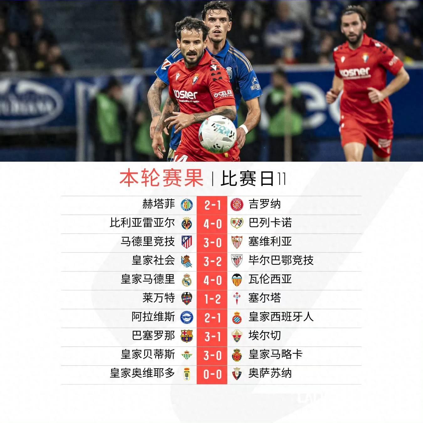 西甲直播,西甲赛程,西甲积分榜,皇马vs巴萨直播,西甲比分预测/为中文用户提供2025赛季西甲联赛全方位资讯:免费高清中文直播入口、赛程表、积分榜更新、皇马与巴萨动态追踪、竞彩推荐与比分预测。西甲第11轮的比赛在11月1日至4日间落下帷幕。各大豪门纷纷迎来胜利,展现出强劲的状态。以下是各场精彩对决的回顾: