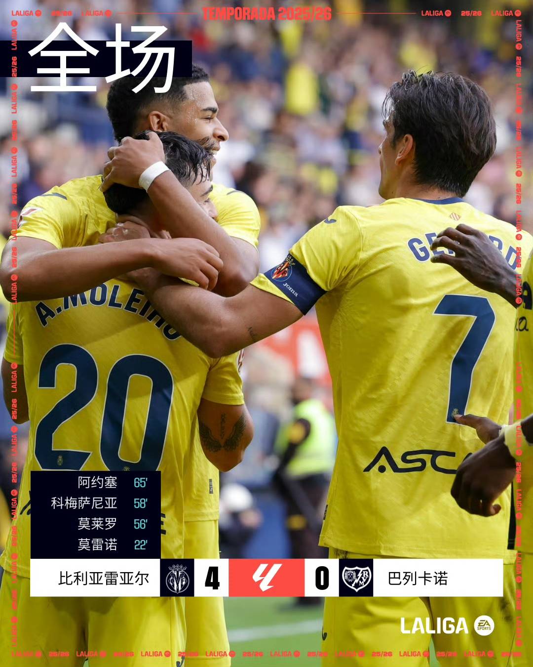 比利亚雷亚尔主场迎战巴列卡诺。赫拉德-莫雷诺的进球为黄潜打破僵局,随后莫莱罗、科梅萨尼亚和阿约塞-佩雷斯的进球将比分定格为4-0,确保球队以一场大胜延续主场不败的纪录。比利亚雷亚尔本赛季主场表现出色,已取得5胜1平。