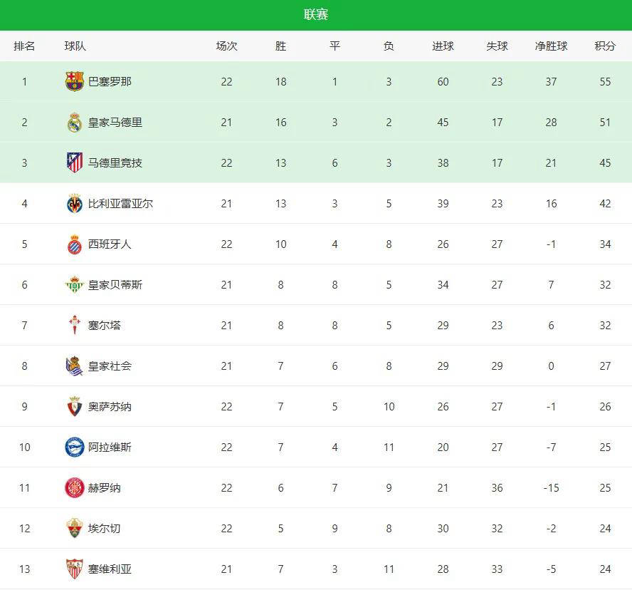 西甲直播,西甲赛程,西甲积分榜,皇马vs巴萨直播,西甲比分预测/为中文用户提供2025赛季西甲联赛全方位资讯:免费高清中文直播入口、赛程表、积分榜更新、皇马与巴萨动态追踪、竞彩推荐与比分预测。北京时间2月1日凌晨,西甲联赛第22轮全面开战,焦点之战中,巴塞罗那凭借强势表现客场3-1战胜埃尔切,年轻球星亚马尔表现抢眼,贡献两次关键助攻,帮助球队连续四场比赛保持全胜战绩。与此同时,马德里竞技意外遭遇爆冷,0-0被倒数第二的莱万特逼平,亿万身价前锋阿尔瓦雷斯连续多场哑火,令主帅西蒙尼争冠希望骤减。而比利亚雷亚尔则在客场以2-2战平奥萨苏纳,虽然丢掉了宝贵分数,但依然稳居欧冠资格区,接下来仍需全力冲刺。本轮比赛结束后,巴萨继续稳坐积分榜首,马竞和比利亚雷亚尔表现不佳,唯一还能与巴萨保持竞争态势的只有皇马。