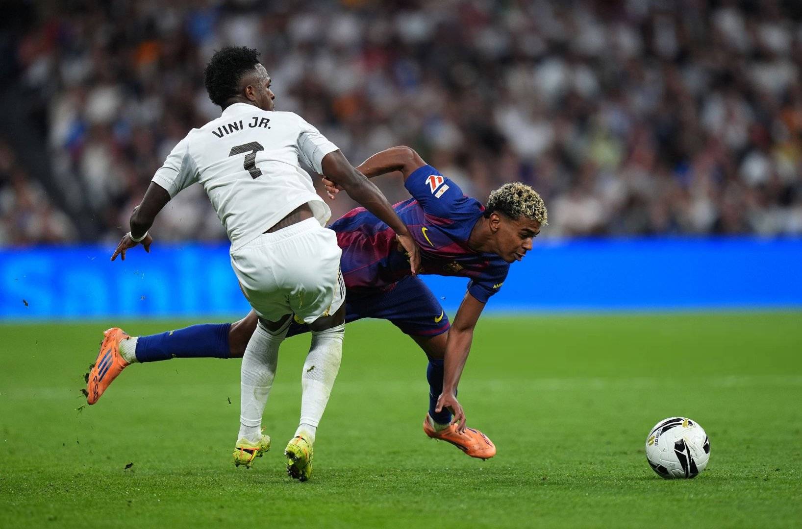 比赛刚开始,场上便出现了一次小插曲。皇马通过一次快速反击制造了威胁,维尼修斯在禁区内与亚马尔发生接触倒地。主裁判原本判定是巴萨犯规,随即判给皇马点球。然而,经过VAR回放后,裁判发现是皇马球员小熊犯规在先,点球被取消,巴萨暂时松了一口气。