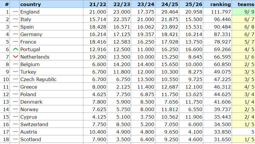 值得注意的是,欧足联的联赛排名积分系统是基于过去五年内各联赛俱乐部在欧洲比赛中的表现,每五年更新一次,该排名直接决定各国家联赛在欧洲赛事中的资格分配。目前排名前四的联赛拥有4个欧冠直接晋级名额,而一旦西甲跌至第五,则仅能获得3个名额。目前西甲与意甲的积分差距微乎其微,仅为0.31分,这意味着西甲面临被挤出前四的巨大压力。