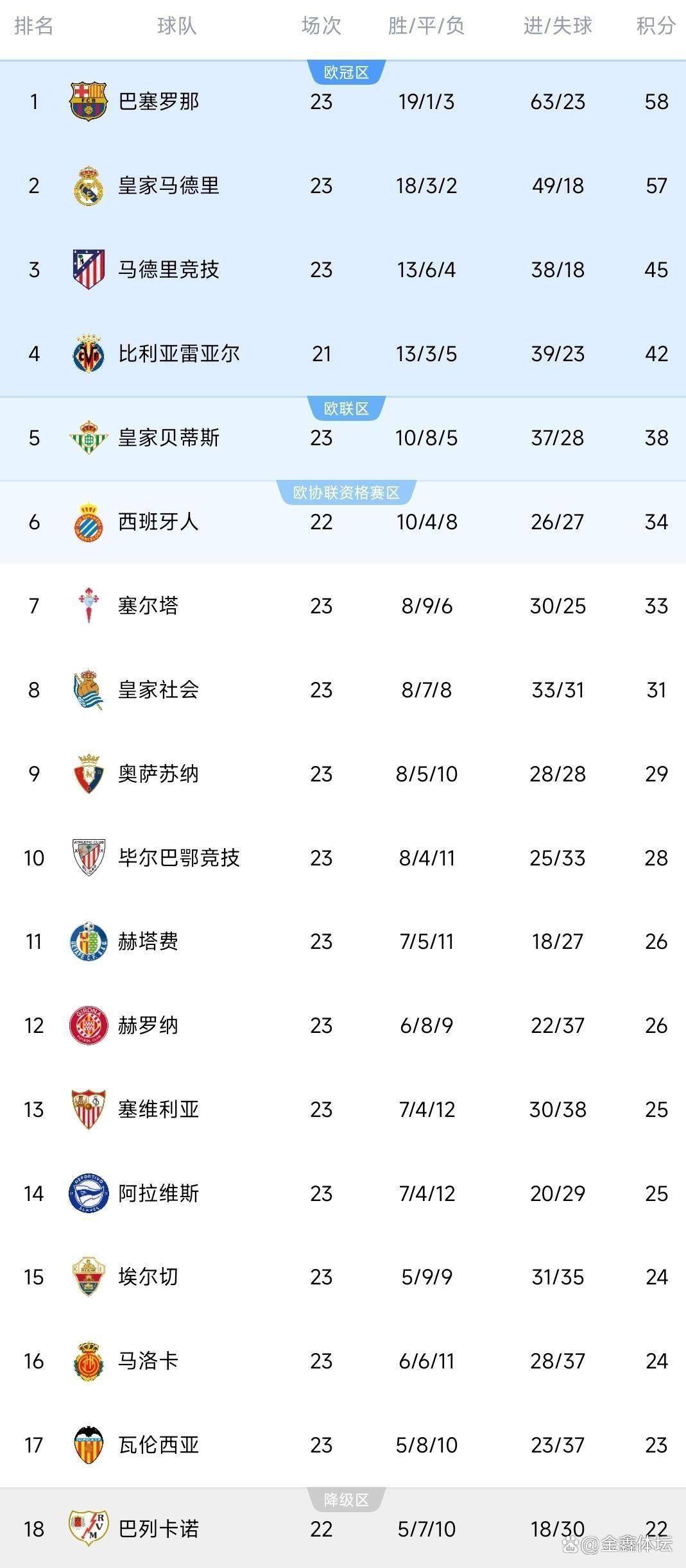 西甲联赛免费高清直播+实时赛程积分榜+竞彩预测全覆盖(2025赛季)伴随皇马巴萨只差1分马竞主场翻车西甲积分榜如下:前二差1分