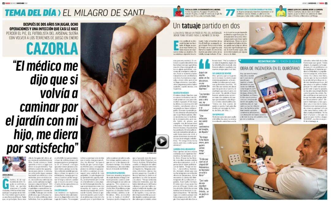 “英国有些医疗专家说,我可能要失去这条腿;但西班牙的医生一直告诉我没事儿,这让我拥有了乐观心态。”通过植皮,卡索拉看到了隧道的尽头,而那几个月,最糟糕的不是伤病本身,而是孤独的生活状态。“我在西班牙治疗,远离留在伦敦的家人,长期见不到孩子们……”当时卡索拉考虑过退役,是小恩佐一句“爸爸,我想继续看你踢球”,让西班牙中场战胜消极情绪、怀着重返球场的欲望醒了过来。